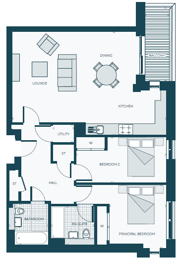 A beautiful open plan, two bedroom apartment with en-suite from the Principal Bedroom, utility and private balcony