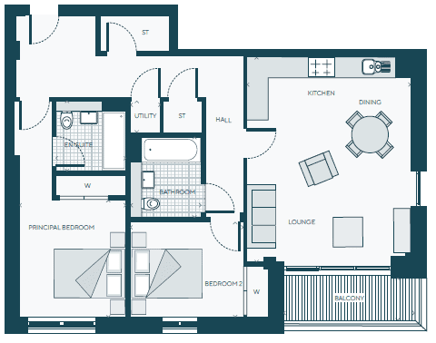 A beautiful open plan, two bedroom apartment with en-suite from the Principal Bedroom, utility and private balcony