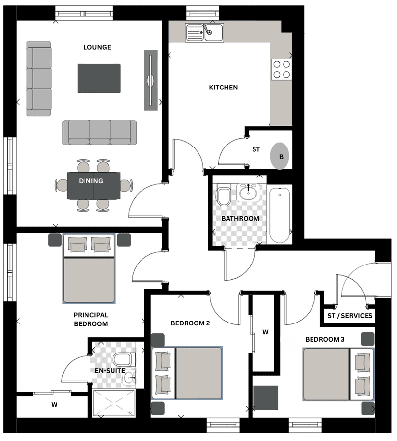 A stylish three bedroom ground floor apartment with separate kitchen. The principal bedroom is complete with en-suite and fitted wardrobe.