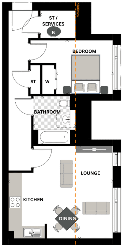A stylish one bedroom top floor open plan apartment. The bedroom is complete with a fitted wardrobe.